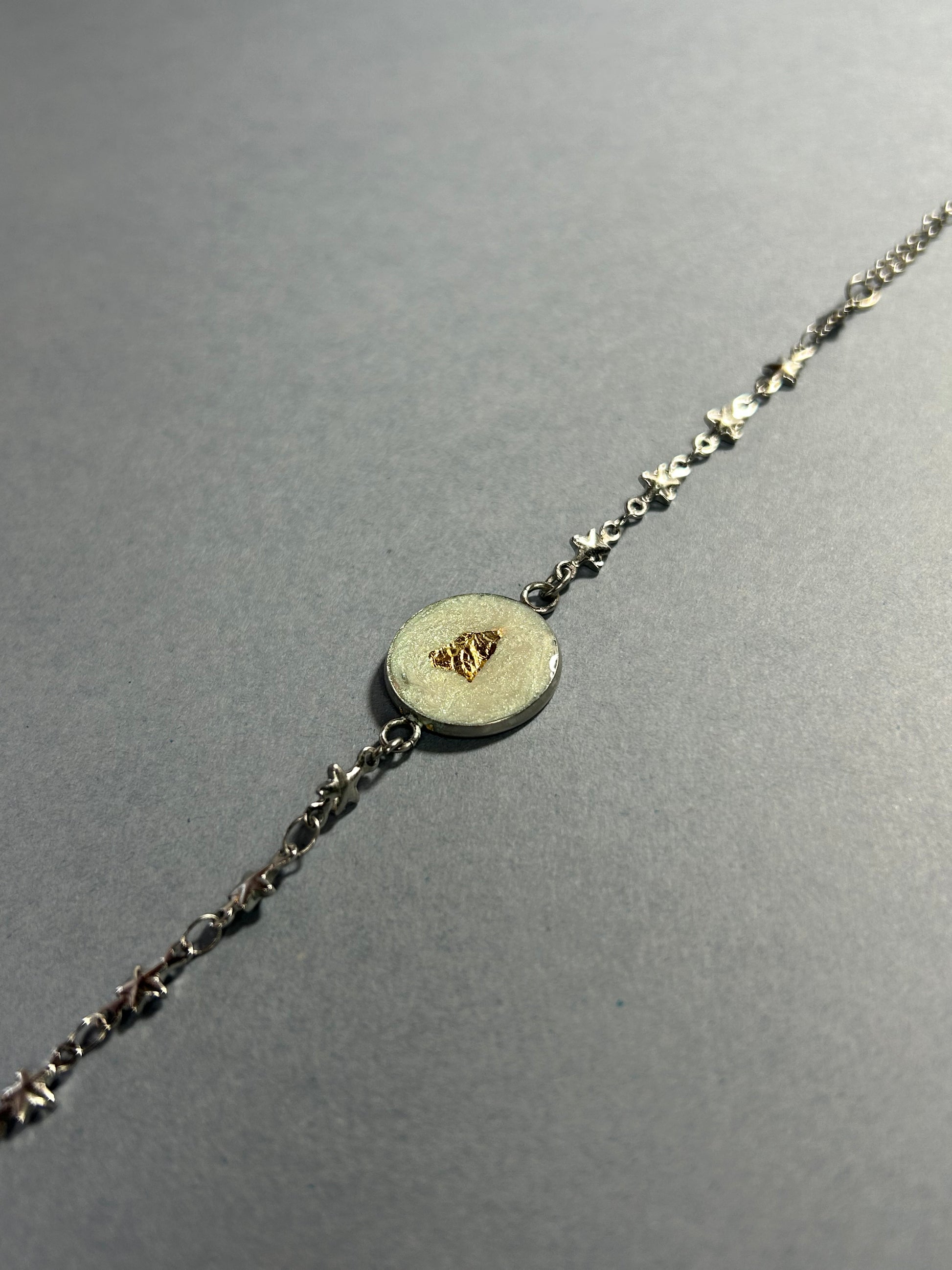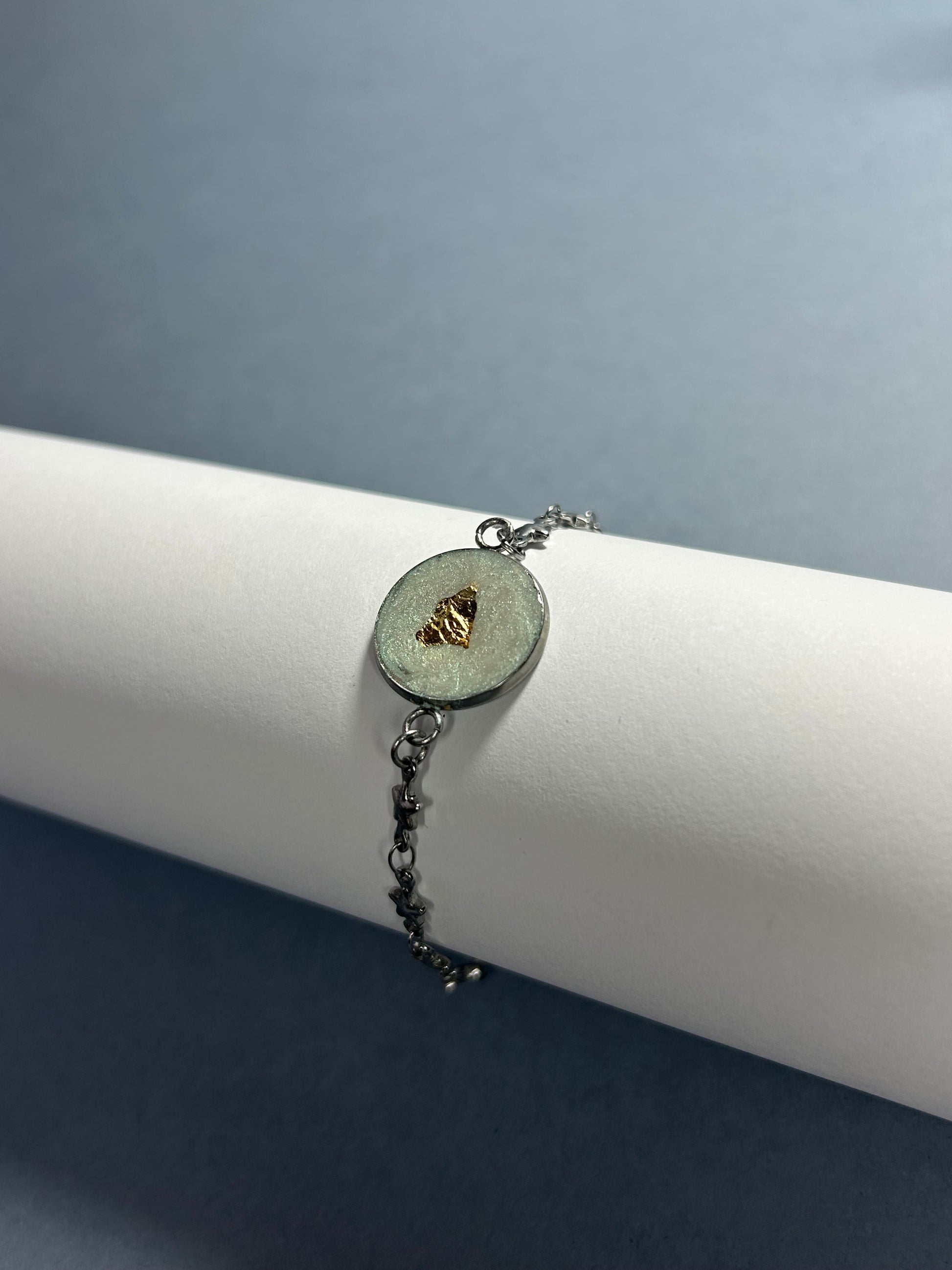 Pulseira ajustável em aço inoxidável, com pingente em tom amarelo/verde com um folha de ouro ao centro
