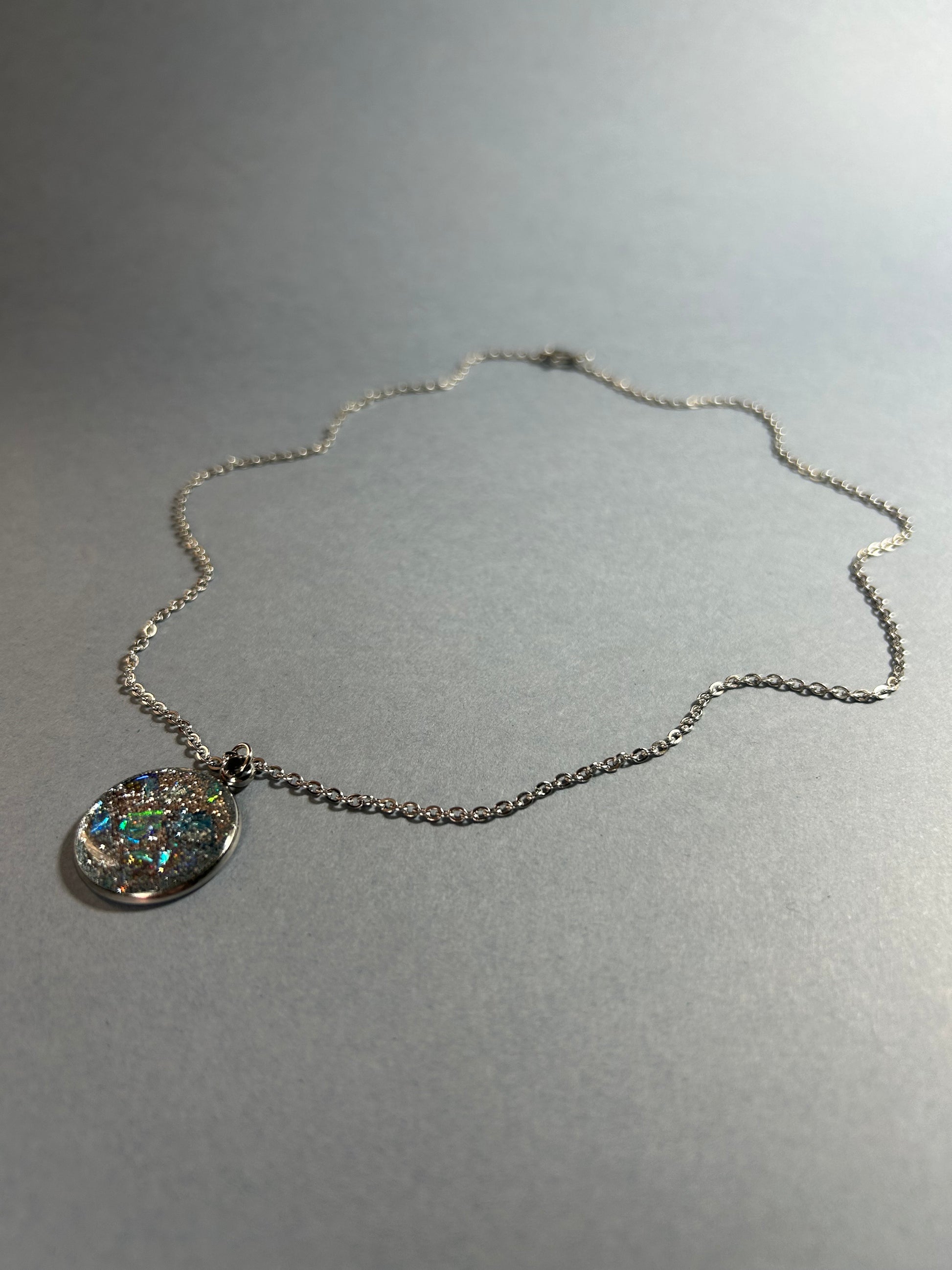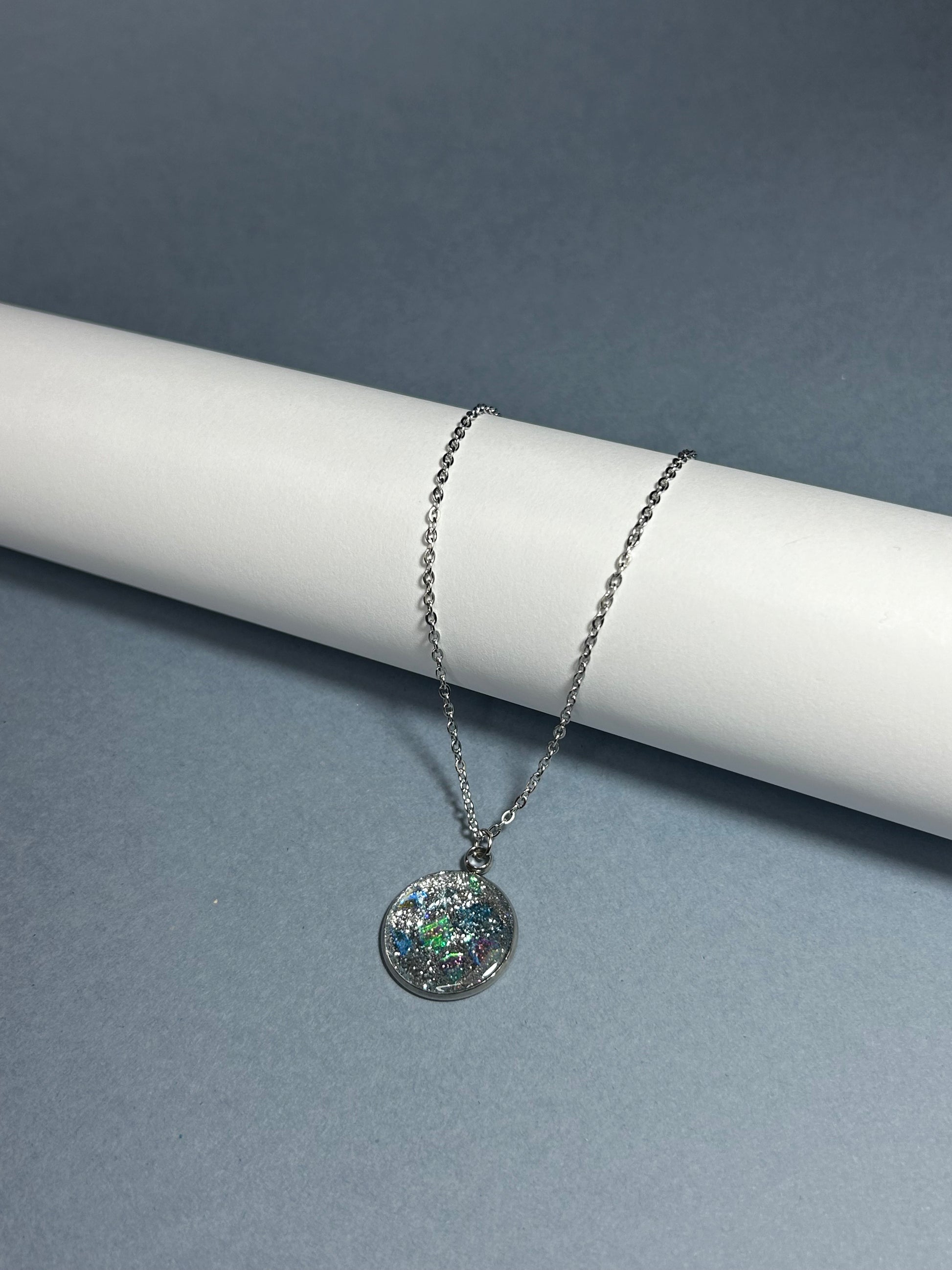 Colar em aço inoxidável, 50cm, com pingente em resina epóxi.